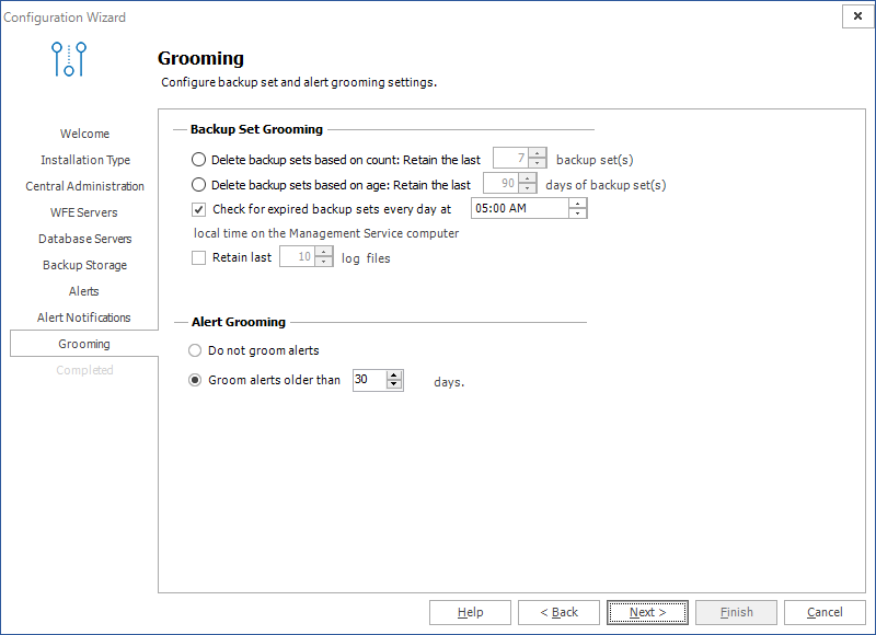 If you choose, Metalogix Backup for SharePoint can groom older alerts and backup sets automatically to conserve storage space. When it grooms data, Metalogix Backup for SharePoint automatically removes the old data from the backup location or the alert log. You can use the Grooming tab in the Configuration wizard to set up the grooming options.