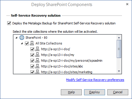 The Self-Service Recovery feature is optional. You do not have to deploy it to use Metalogix Backup for SharePoint. You should deploy the Self-Service Recovery feature on every site collection where you want to use it.