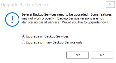 The Management Console, Management Service and the Backup Service require the same version otherwise no backup or restore operation can occur. You can upgrade the Backup Service in two ways: