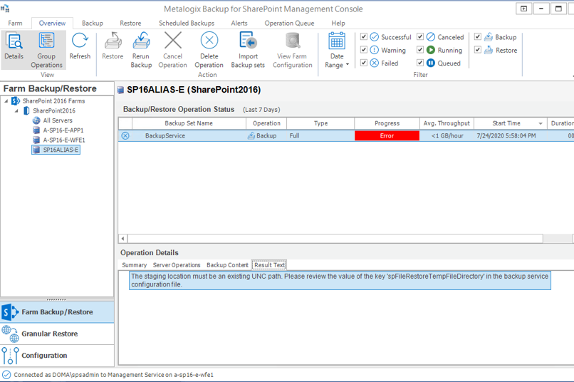The error message appears in the Result Text tab of the Operations Detail pane: The staging location must be an existing UNC path. Please review the value of the key spFileRestoreTempFileDirectory in the Backup service configuration file.